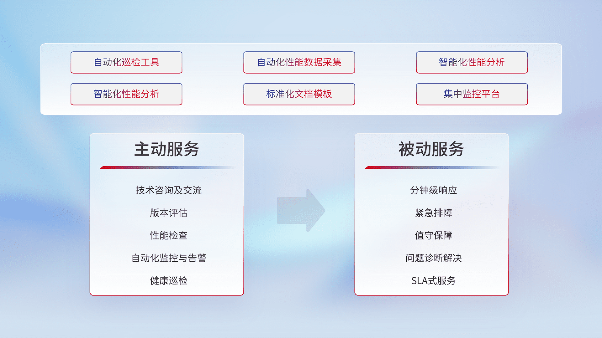 智能化工具和标准化文档,,,,保障服务质量,,,,提供主动服务(包含技术咨询、、、、版本评估、、、、性能检查、、自动化监控与告警、、、健康巡检)和被动服务包含(分钟级响应、、紧急排障、、、值守保障、、问题诊断解决、、、、SLA服务)。。